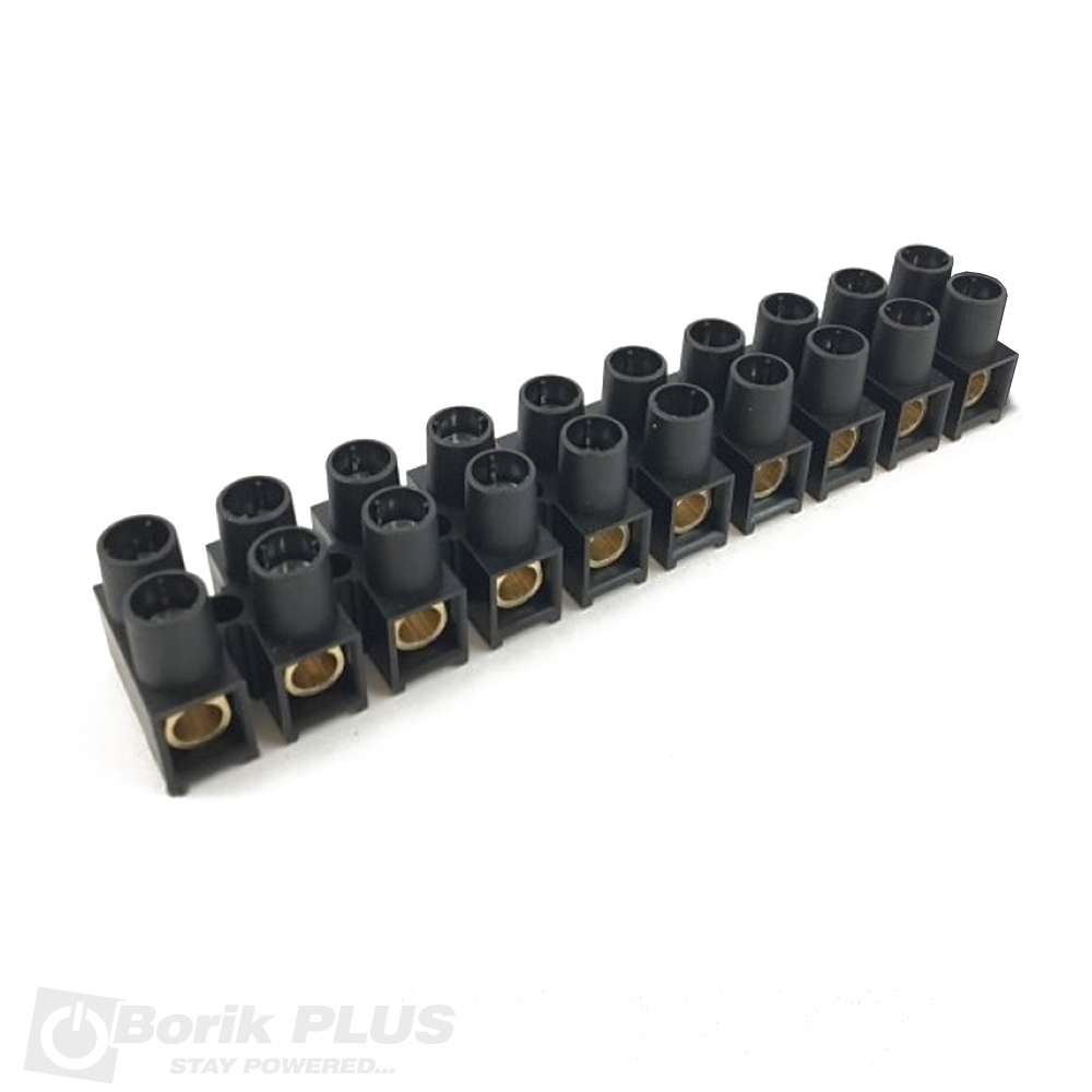 Redna stezaljka, poznatija kao luster klema. Za zice od 10 do 16 mm2, crne boje plasticna. Prikazana cena je za jedan segment koji sadrzi 10 spojnica. Spojnice i srafovi su celicni, galvanizovani cinkom. Plastika izolatora je bez halogena.Srafovi su duboko zasrafljeni ne mogu da se izgube niti ispadnu. Za odvrtanje koristiti ili ravni ili krstasti srafciger. Komplete srafcigera pogledajte ovde.