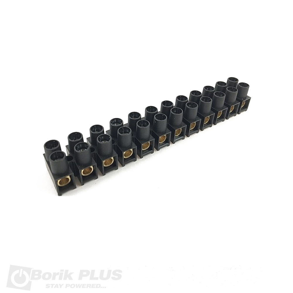 Redna stezaljka, poznatija kao luster klema. Za zice do 2.5 mm2, crne boje plasticna. Prikazana cena je za jedan segment koji sadrzi 12 spojnica. Spojnice i srafovi su celicni, galvanizovani cinkom. Plastika izolatora je bez halogena.Srafovi su duboko zasrafljeni ne mogu da se izgube niti ispadnu. Za odvrtanje koristiti ili ravni ili krstasti srafciger. Komplete srafcigera pogledajte ovde.