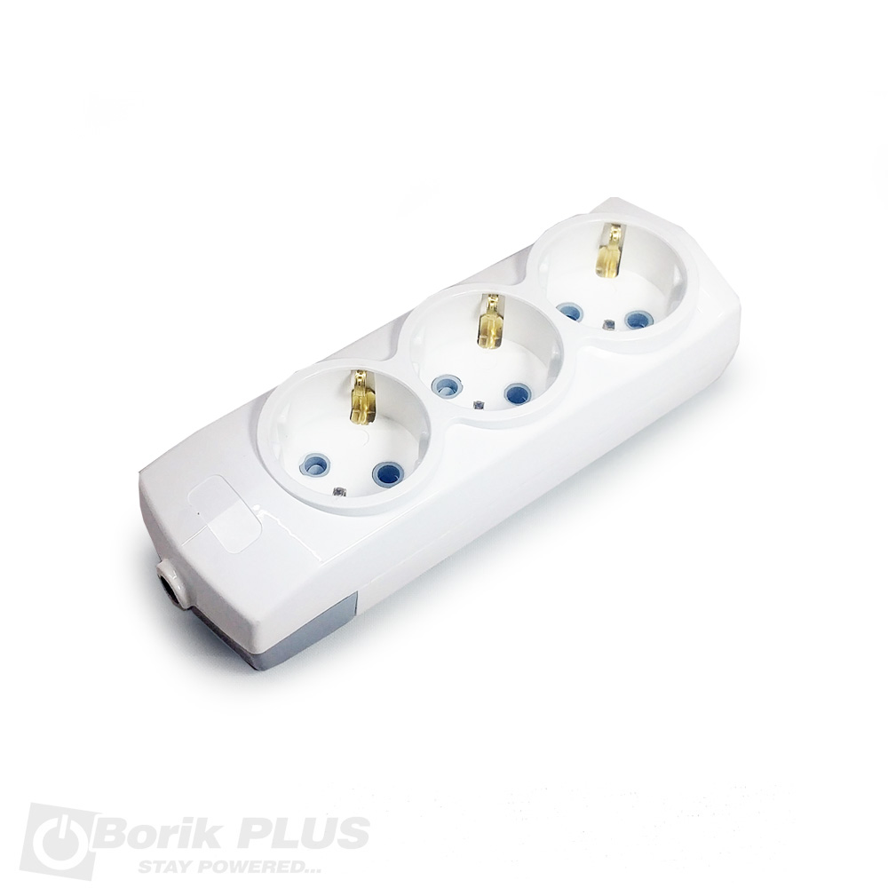 Trostruka prenosna priključnica bele boje bez kabla. Koristi se kao razdelnik za napajanje tri potrosaca sa šuko uticnicama. Za struju do 16A, i maksimalnog napona do 250V. Maksimalno snaga svih potrosaca prikacenih na produzni kabl ne sme biti veca od 3500W. Bez provodnika. Preporuceni provodnik (kabl) H05VV-F 3G1,5 (PP/J-Y 3×1,5). Bez prekidača