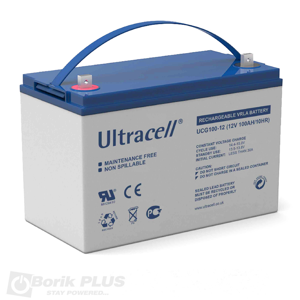 Ultracell UCG 100-12 olovna GEL VRLA baterija sa konektorom F10 (sraf sa navojem M6). Idealna za ugradnju u protivpozarnim centralama, UPS uredjajima i solarnim aplikacijama. Posebno pogodna za upotrebu u ciklicnom rezimu zbog pojacanog broja ciklusa. UCG seriju odlikuje i sposobnost za rad na nesto visim temperaturama iz razloga sto GEL umanjuje mogucnost isparavanja elektrolita iz baterije. Najpopularnija kod firmi koje se bave ugradnjom i odrzavanjem alarmnih sistema i protivpozarnih centrala. Uvoz iz Velike Britanije.