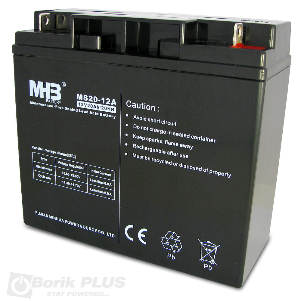 MHB olovna VRLA AGM baterija MS 20-12. Napravljena za upotrebu u Standby rezimu. Najcesce se koristi u UPS uredjajima i u inverterima za podrsku pumpama centralnog grejanja MC 200B. Bez odrzavanja. Moze se koristiti i u ciklicnom rezimu ali joj se zivotni vek smanjuje. Moze se montirati u bilo kom polozaju osim naopako. Najbolji odnos cene i kvaliteta je ono u cemu MHB baterije nemaju konkurenciju. Nije za upotrebu u busterima