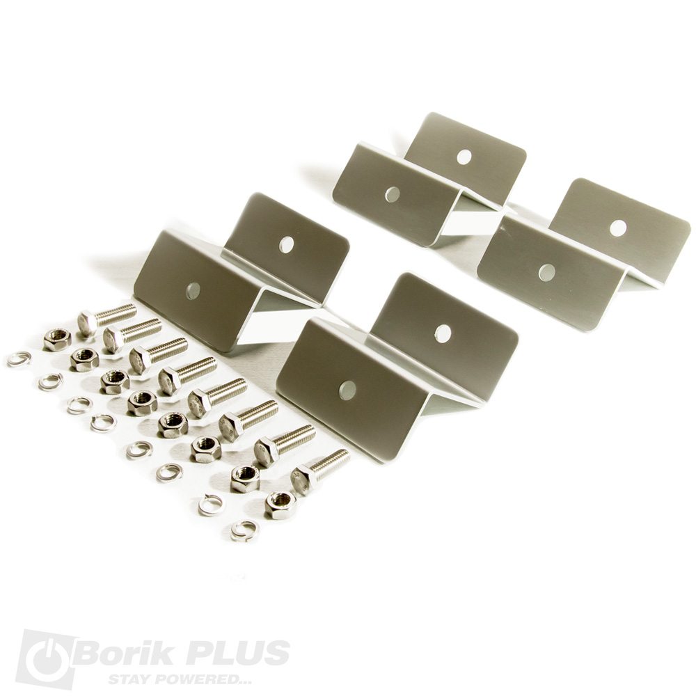 PRIKAZANA CENA SE ODNOSI NA 4 NOSACA SA SRAFOVIMA. Nosac solarnog panela sastoji se od cetiri Z nosaca, osam masinskih srafova, osam podloski i osam matica. Nosac solarnog panela napravljen je eloksiranog aluminijuma a srafovi od prohroma. Montaza solarnog panela pomocu ovog nosaca vrsi se srafovima u vec postojece rupe koje se nalaze na ramu panela. Za montazu potrebno koristiti kljuc 10