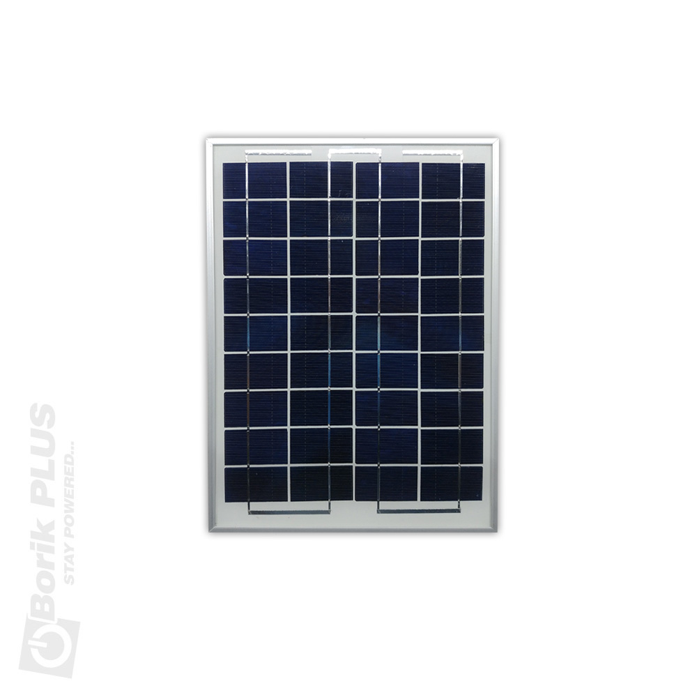 Polikristalni fotonaponski solarni panel 10W – 12V. Polikristalni paneli vrhunskog kvaliteta A klase. Proizvodjac garantuje da ce panel davati 80% snage linearno opadajuci tokom 25 godina. Solarni fotonaponski paneli koriste se za proizvodju elektricne energije upijajuci besplatne Sunceve zrake koji padaju na zemlju. Spajanjem celija unutar panela bilo u rednu ili paralelnu vezu, proizvodjac u proizvodnji odredjuje da li ce napon na izlazu biti 12V ili 24V. Napon koji solarni paneli daju moze se koristiti direktno preko kontrolera ili pretvarajuci ga na 230V pomocu invertera. Solarni fotonaponski paneli takodje se mogu vezati redno ili paralelno u zavisnosti od komponenti samog sistema. Vise podataka o ovom panelu u tabeli:
